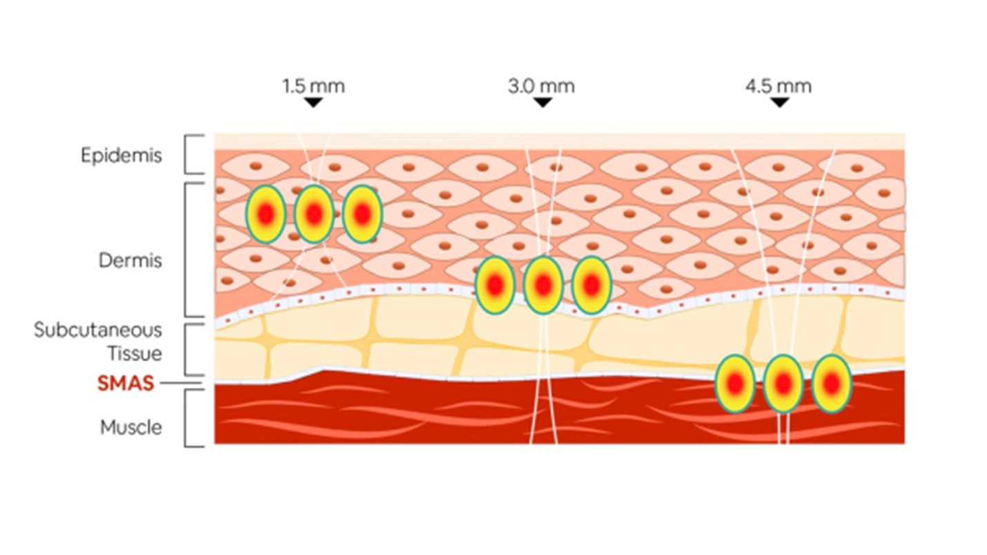 A: HIFU stands for High Focused Ultrasound and is a method of delivering heat energy by focusing ultrasound energy on a specific area. This HIFU technology is being applied to various fields, depending on its intensity. The high intensity range of therapeutic ultrasound, 100 to 10,000 W/cm2, is mainly used for tissue ablation, while intensities of 0.125 to 3 W/cm2 are utilized for drug delivery purposes. For skin care applications that Reziena focuses on, an intensity of 5 W/cm2 or higher is used, and by creating coagulation in the inner 1.5mm, 3.0mm, and 4.5mm of the skin without damaging the outer surface of the skin, it helps produce collagen and elastin, improving elasticity and wrinkles. It is effective.